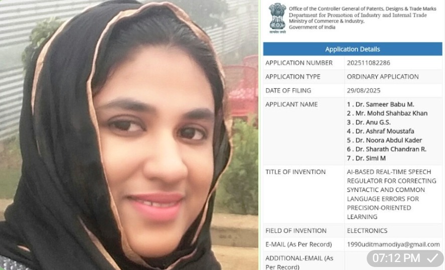 अलीगढ़ मुस्लिम विश्वविद्यालय (AMU) की शिक्षा विभाग की सहायक प्रोफेसर डॉ. नूरा अब्दुल कादर ने एक नई खोज “AI-Based Real-Time Speech Regulator for Correcting Syntactic and Common Language Errors for Precision-Oriented Learning” के लिए पेटेंट हासिल किया है। यह पेटेंट भारत सरकार के वाणिज्य और उद्योग मंत्रालय के कंट्रोलर जनरल ऑफ पेटेंट्स के कार्यालय द्वारा प्रकाशित किया गया है।